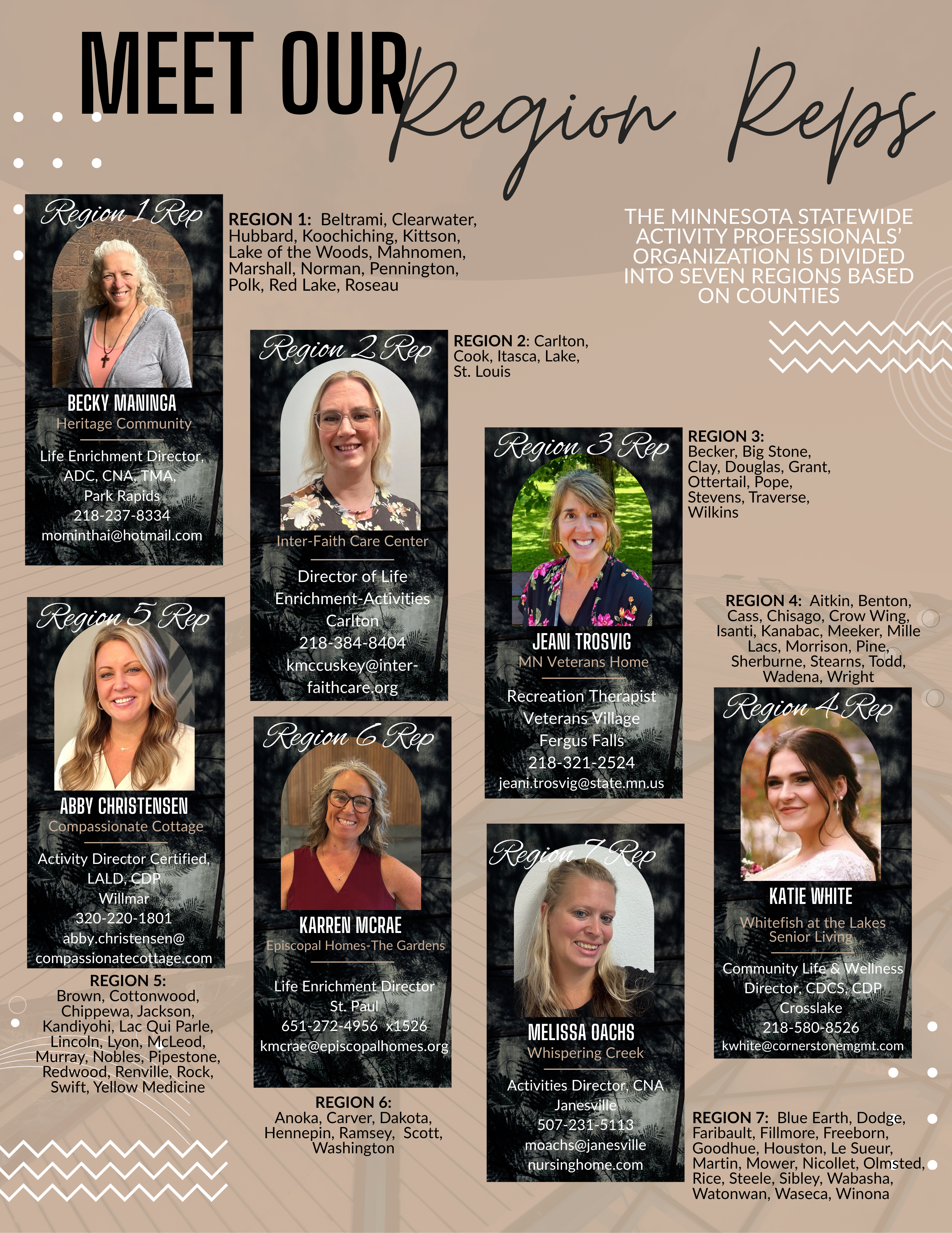 MNSWAP is one of the nation’s leader in state activity organizations. For over 35 years, we have been offering affordable quality education events designed to support and prepare activity professionals in aging services careers. In addition to the statewide opportunities, regional meetings and educational events occur throughout the state.